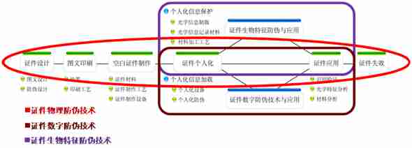 从前面的分析可以看出,现代证件防伪技术,主要包含物理防伪技术、数字防伪技术和生物特征防伪技术三个方面。三个方面相互支撑、各司其责:证件物理防伪技术,为保证证件实体不被伪造、变造提供技术保障,贯穿证件整个生命周期;证件数字防伪技术则要保证证件电子信息在生成、存储、交互等过程中不被伪造、篡改窃取等;而证件生物特征防伪技术通过比对证件中登载持证人生物特征信息,实现“人证同一性”认证,防证件被冒用。