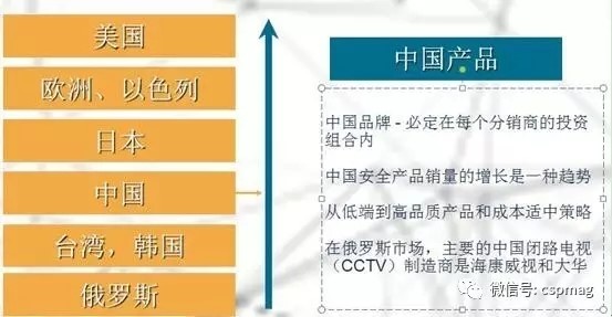 根据The Freedonia Group, Inc研究人员保守预测,截止到2019年,美国安防产品类市场(不包含服务)需求年增长率将超过7.0%以上,安防类产品总需求量达到162亿美元,部分易操作、技术水平要求不是很高的产品将重点依靠进口或海外委托生产或OEM满足需求,其他类对技术要求高、产品附加值大的产品还将重点由本土企业提供。