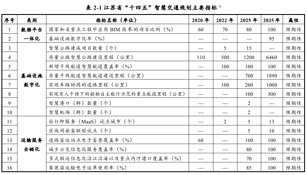 展望2035年,智慧交通整体发展水平进入世界前列。智慧交通基础设施联网成片,交通基础设施数字化率达到95%,智慧公路建设范围覆盖全省80%的高速公路和20%的普通国省道公路,智慧航道建设范围覆盖全省80%的干线航道,建成世界一流的智慧港口和智慧机场。“一站式”、“一单制”运输服务全面实现,省内所有城市均可提供即时响应、按需获取、随需而变的出行即服务,全程透明、可追溯的物流运输体系全面建成,跨区域、跨方式旅客联程运输和货物多式联运能力全国领先。行业治理智能化、协同化格局全面形成,建设完成江苏省交通大脑,实现长三角区域交通运输数据资源互联互通、共享交换,形成以大数据、区块链、人工智能等新技术为支撑的行业治理现代化科学决策体系。智慧交通产业规模全国领先,交通科技进步贡献率达到世界发达国家水平,在智慧公路、智慧航道、智慧港口、智慧枢纽等领域先行突破,形成若干国际领先、广泛应用的智慧交通技术、产品与服务,形成规模化产业。