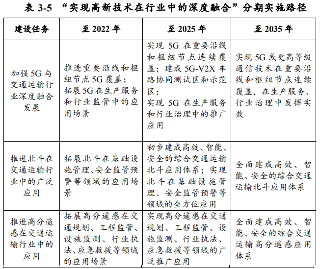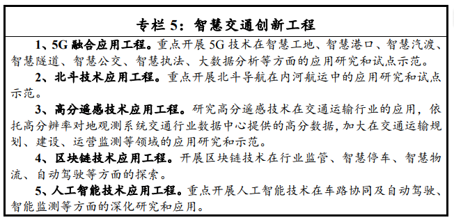创新融合深度化。实现5G在重要沿线和枢纽节点连续覆盖,建成5G-V2X车路协同测试区和示范区,实现5G在生产服务和行业治理等领域的推广应用。初步建成高效、智能、安全的综合交通运输北斗应用体系。实现高分遥感在交通规划、工程监管等至少5个领域的推广应用。初步实现基于区块链的工程质量溯源、运输安全监管、身份识别认证等。实现人工智能在车路协同及自动驾驶、交通基础设施建养、行业治理等领域的广泛推广应用。