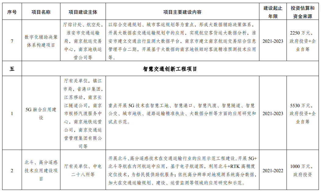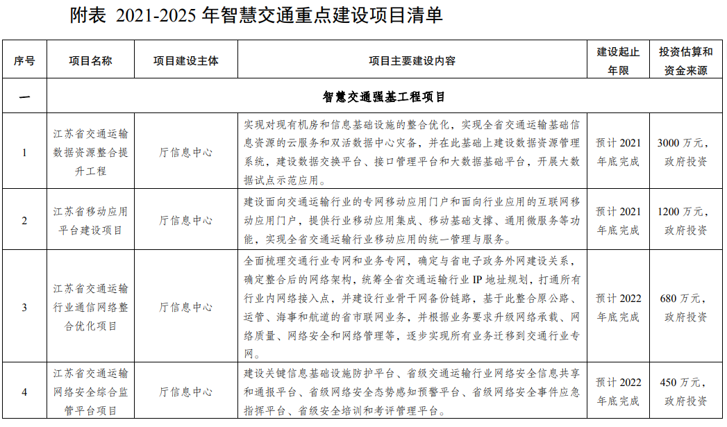 基础设施数字化。完成一批智慧公路、智能铁路、智慧航道、智慧民航、智慧港口和智慧综合枢纽等智慧交通基础设施建设。推动新建、改扩建高速公路和普通国省道公路同步开展智慧公路建设,实现“增量”提质升级,同时以沿江地区、苏南片区、南京都市圈等为重点,完成存量公路智慧化升级1200公里以上,实现“存量”挖潜增效,并在约200公里道路上实现车路协同。以推动京杭运河江苏段走在全国内河航运发展前列为重点,完成京杭运河江苏段全线智慧航道建设,存量航道智慧化升级达到700公里以上,并在重点航段实现有人干预下的船舶自主航行示范。